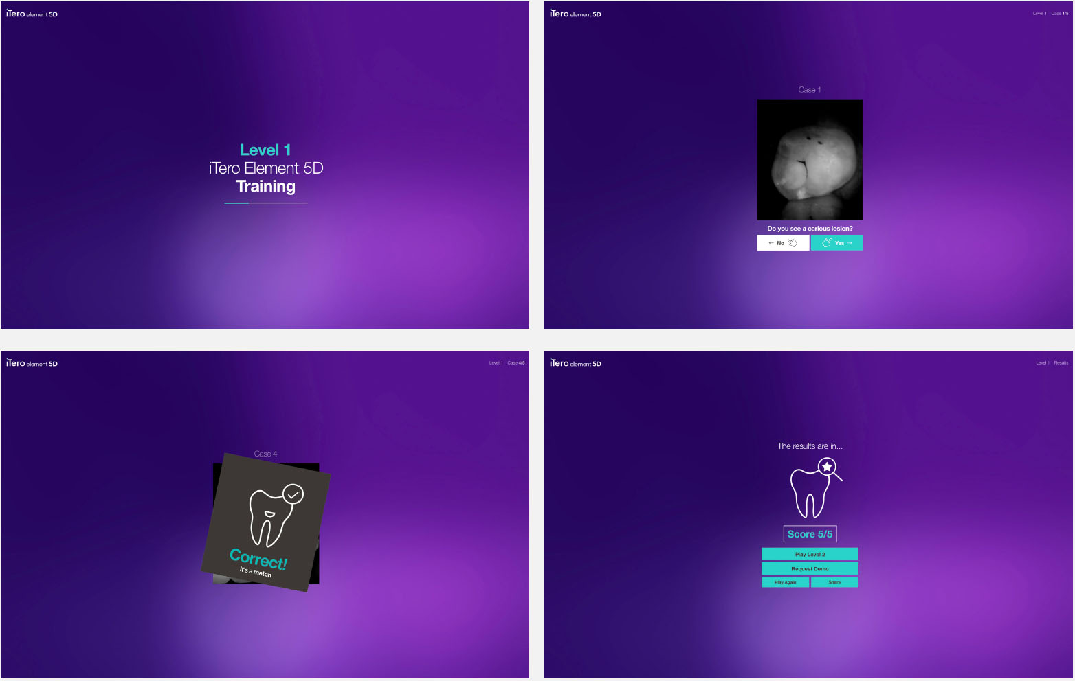 We created an online game that was able to test the dentists’ skills while explaining the product benefits and how to use it. At the end of the game the player will see that he/she was able to detect more cavities with iTero scans than with x-rays. For real patient cases an increased cavity detection would increase thenumber of treatments and lead to business growth for dentist.